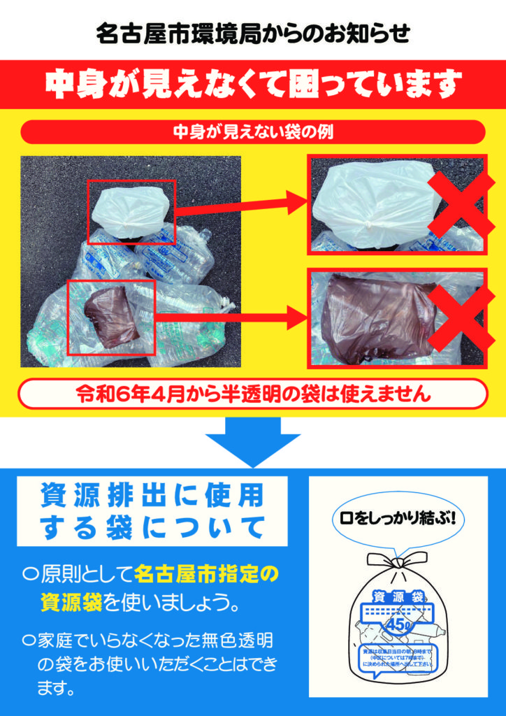 名古屋市が定めた袋を使う。指定場所に決められた時間までに出す。